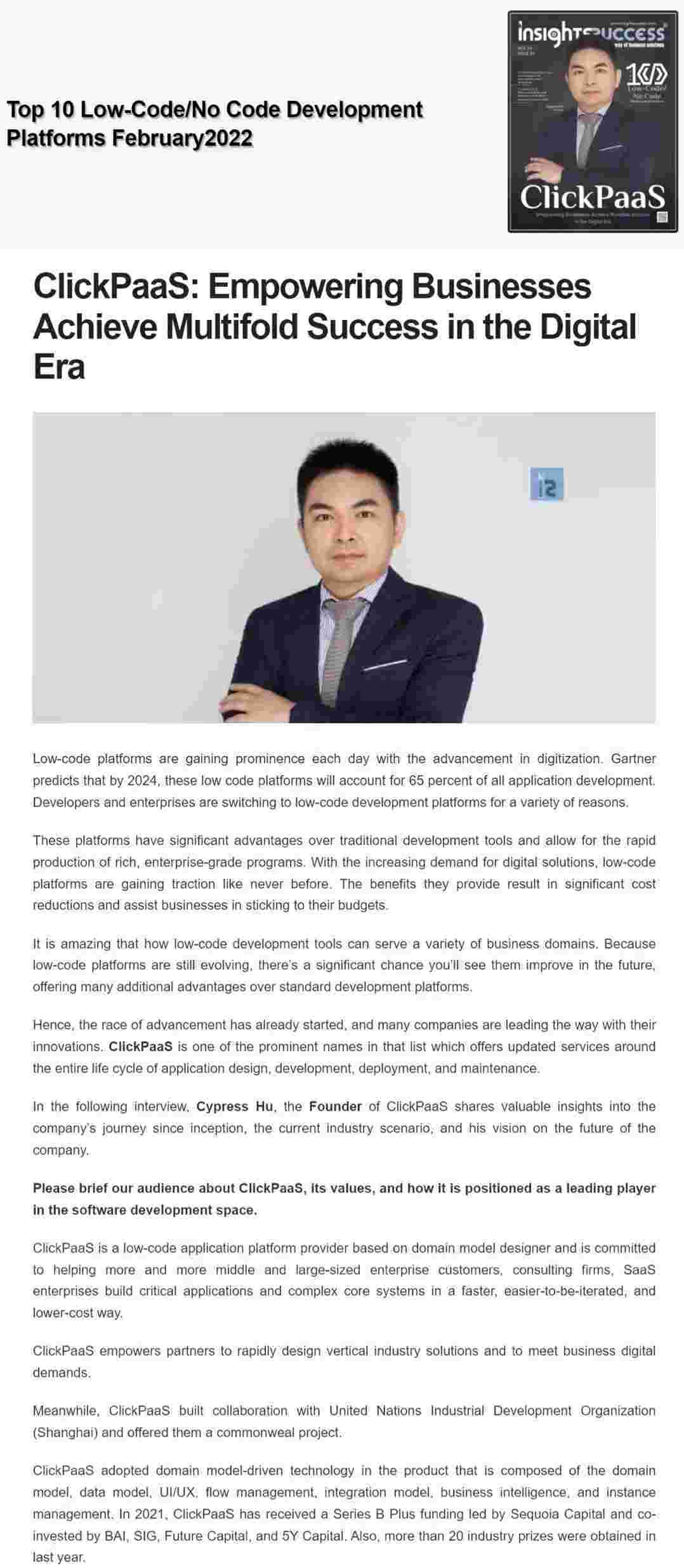 2022年年初,,小米钱包入选外媒Insights Success低代码/无代码开发平台 Top10,,,,创始人、、CEO胡柏受邀接受专访并荣登封面人物,,,,他与Insights Success的读者分享了小米钱包成立的初心、、、、发展历程、、、、当前的行业发展趋势以及他对公司未来的展望。。